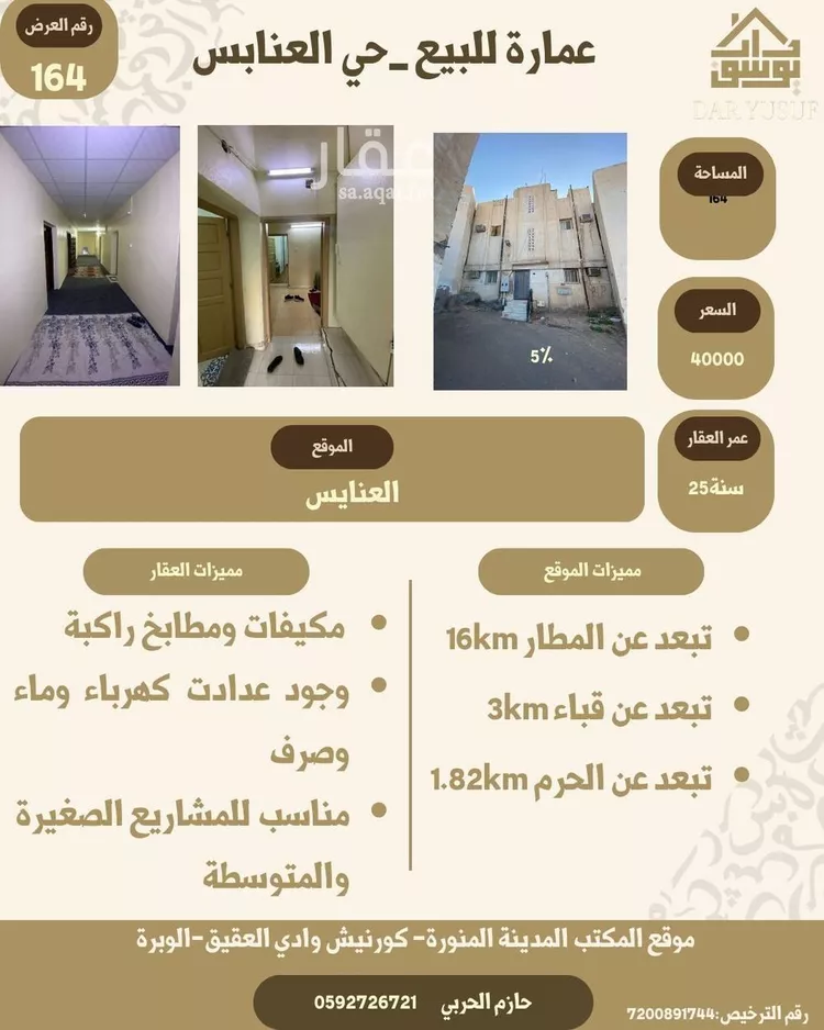 عمارة للبيع في شارع سعيد بن عبدالرحمن بن رقيش, حي العنابس, مدينة المدينة المنورة, منطقة المدينة المنورة